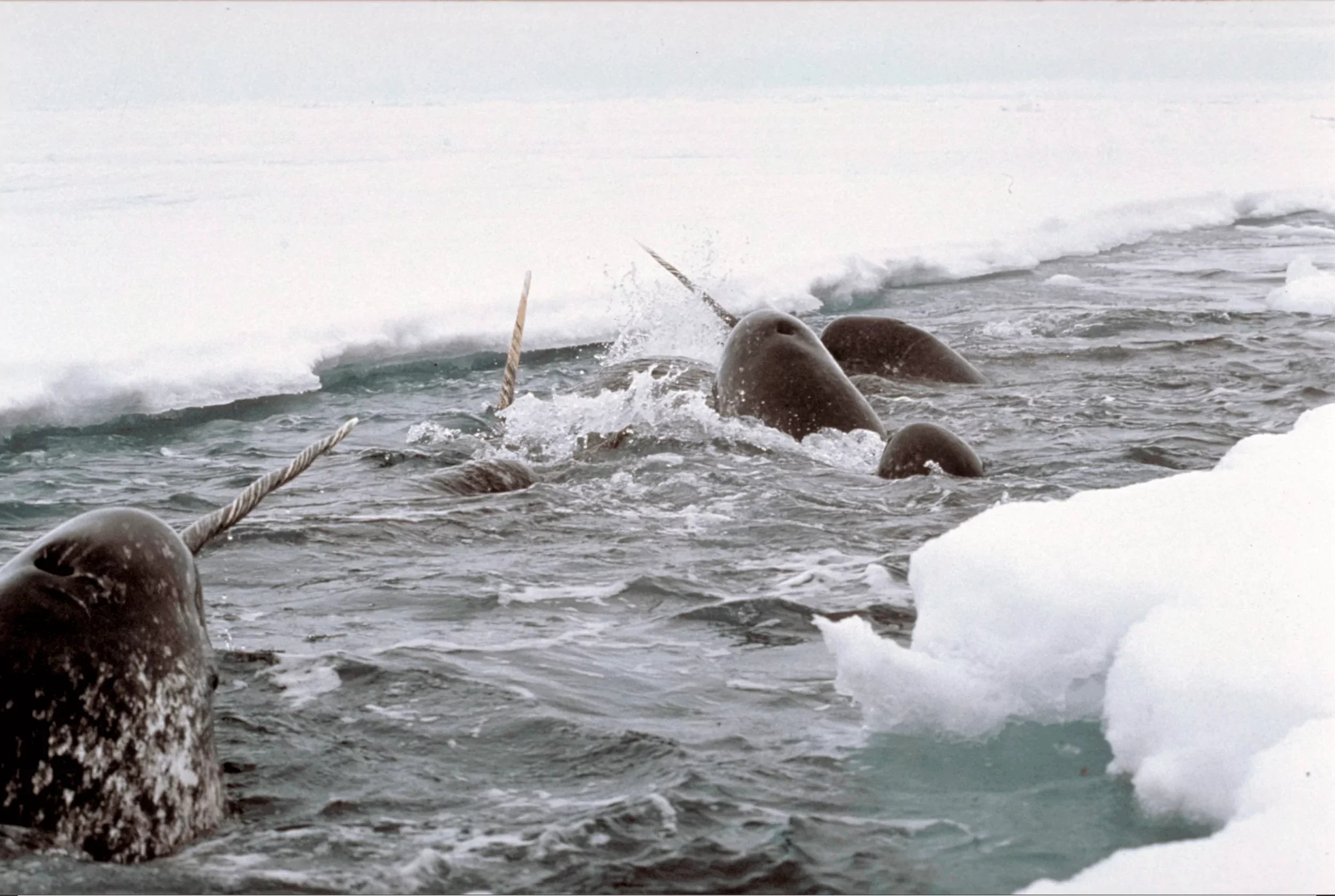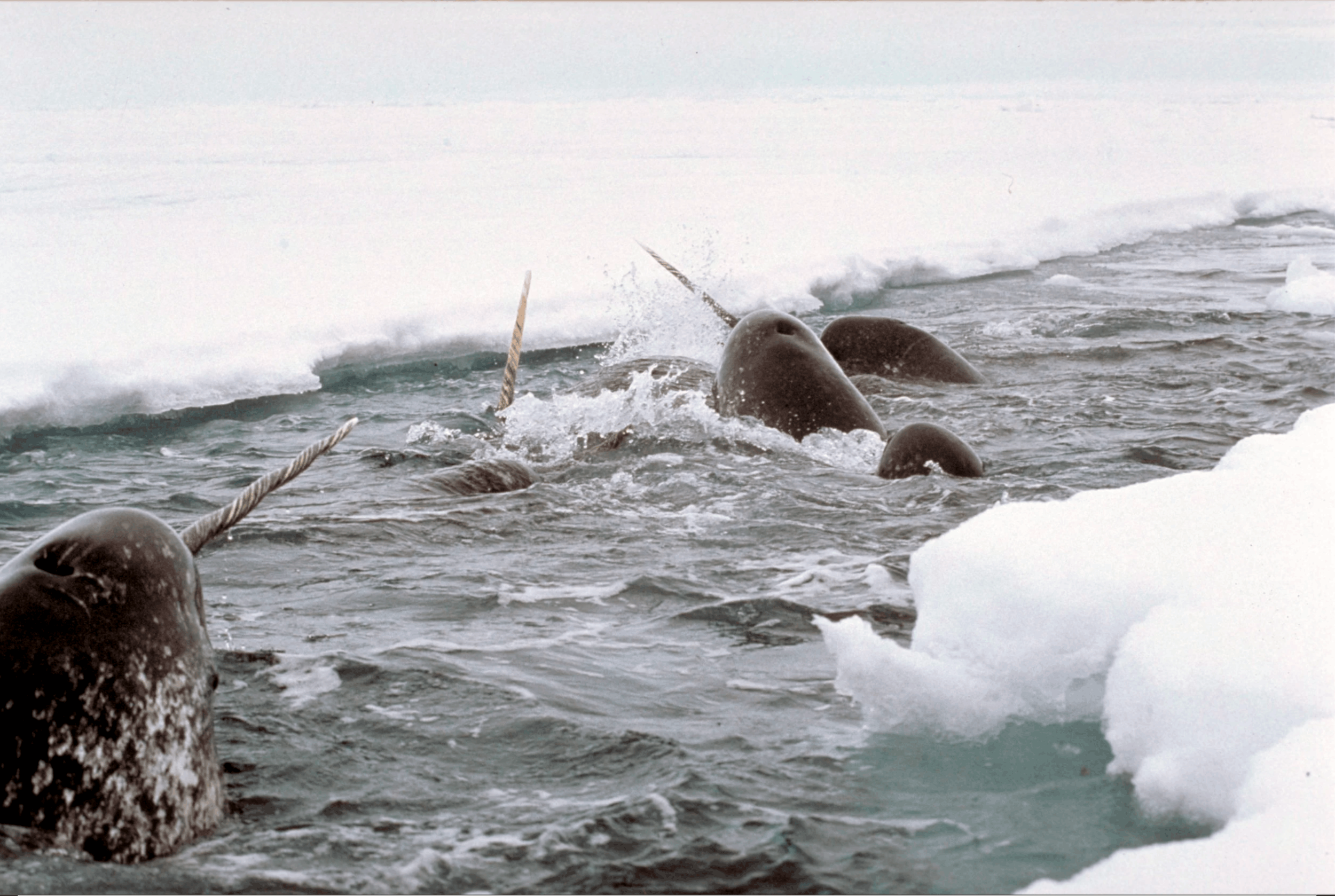 Narwhals live year-round in Arctic waters, spending much of their lives beneath sea ice and surfacing through cracks and openings to breathe.